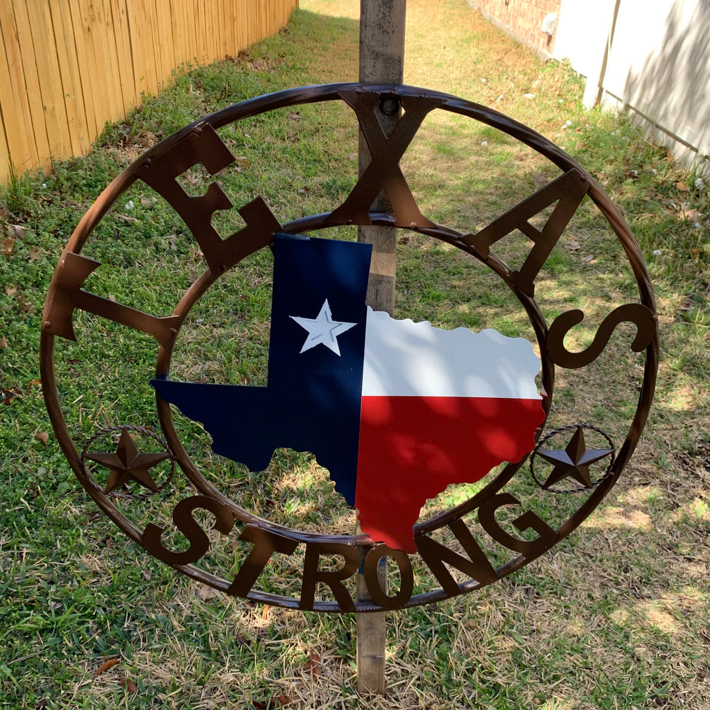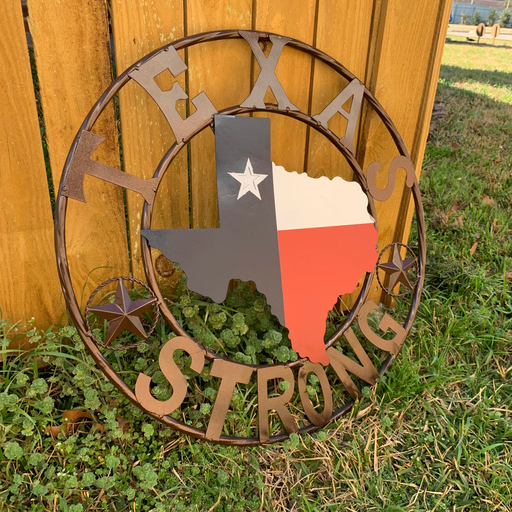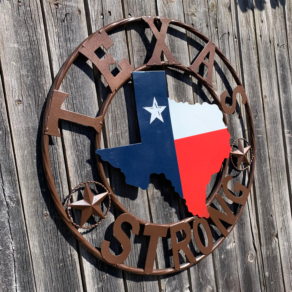 TEXAS STRONG SIGN METAL WALL ART WESTERN HOME DECOR RED WHITE BLUE WITH BRONZE RING HANDMADE #EH13212