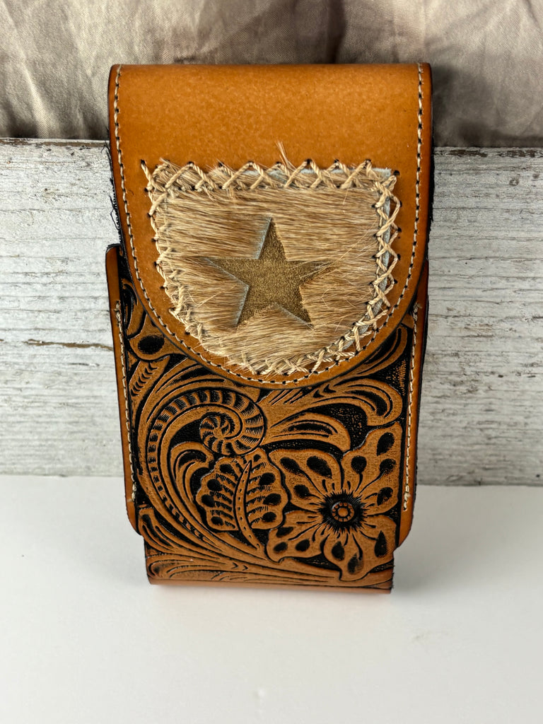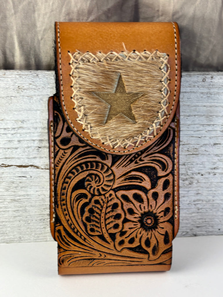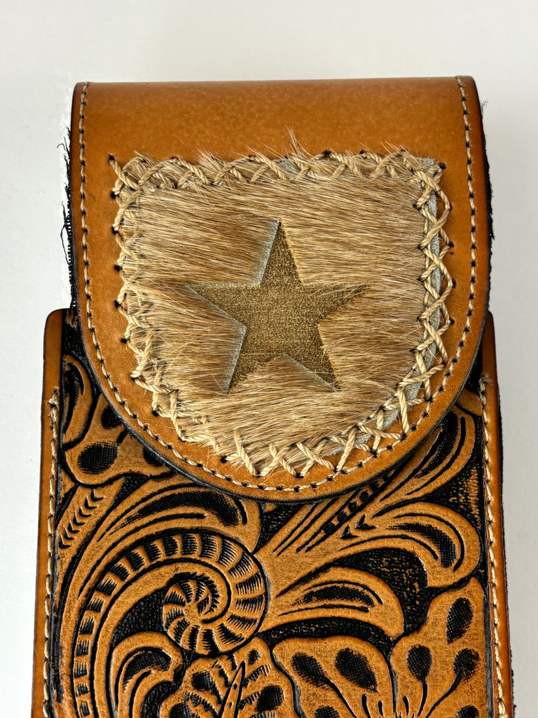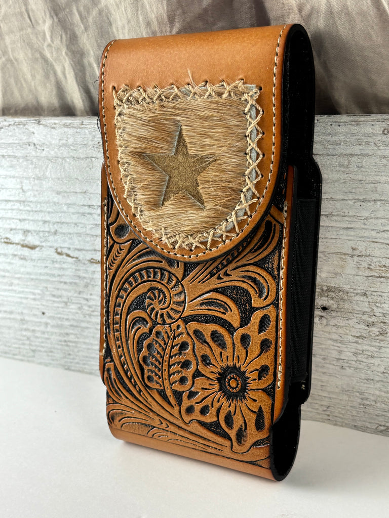 7" STAR GENUINE LEATHER POUCH WITH COWHIDE HAIR STAR WITH VELCRO CLOSURE OVERSIZE UNIVERSAL EXTRA LARGE WESTERN CELL PHONE HOLSTER POUCH BELT LOOP UNIVERSAL