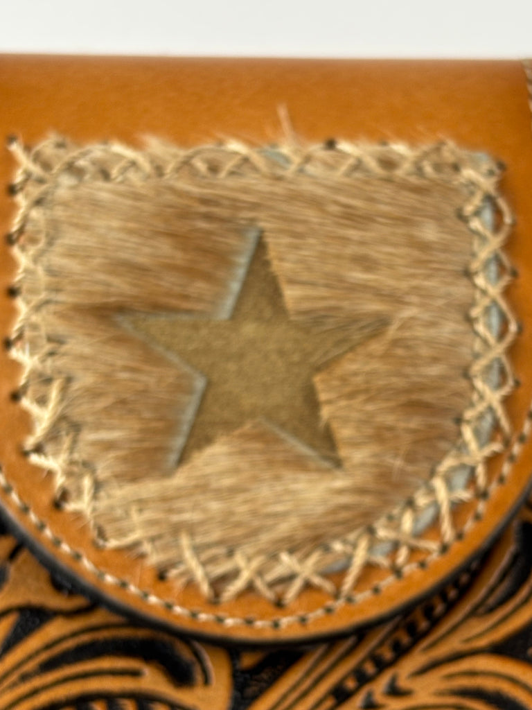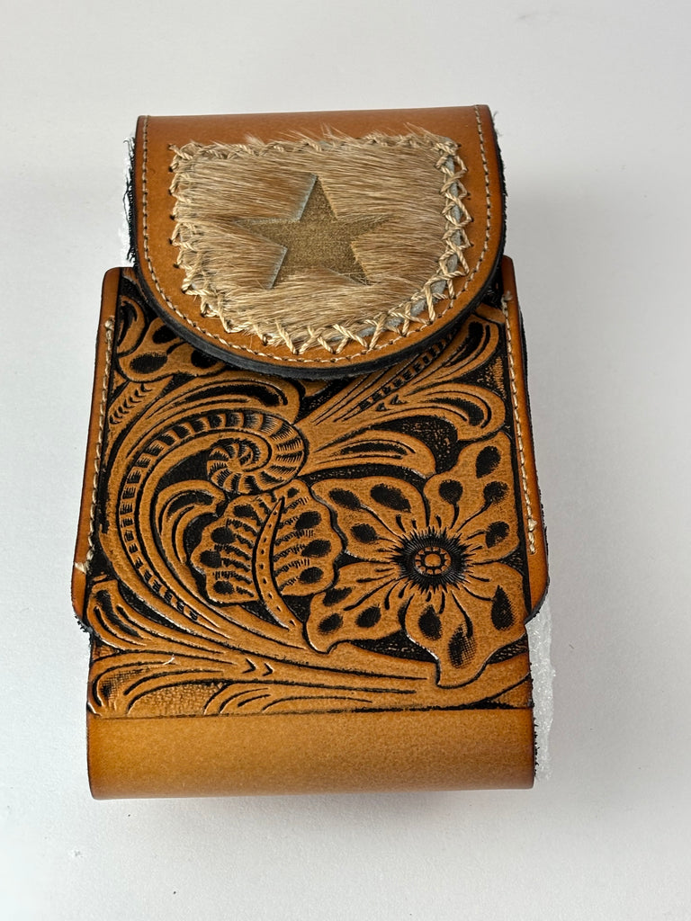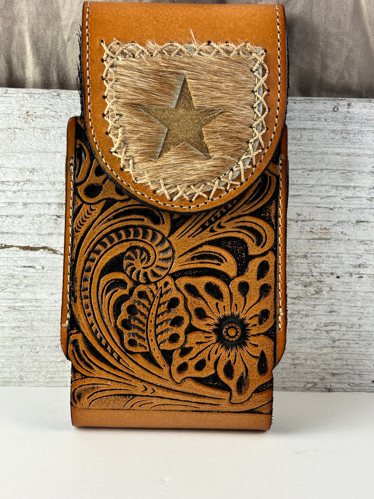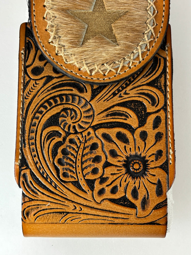 7" STAR GENUINE LEATHER POUCH WITH COWHIDE HAIR STAR WITH VELCRO CLOSURE OVERSIZE UNIVERSAL EXTRA LARGE WESTERN CELL PHONE HOLSTER POUCH BELT LOOP UNIVERSAL