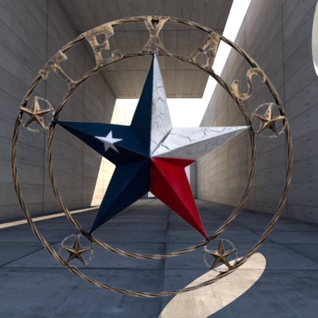 TEXAS CRACKLE STAR RED WHITE BLUE CRACKLE TEXTURE LINES METAL STAR WITH BRONZE TWISTED ROPE RING BARN METAL STAR WESTERN HOME DECOR HANDMADE NEW