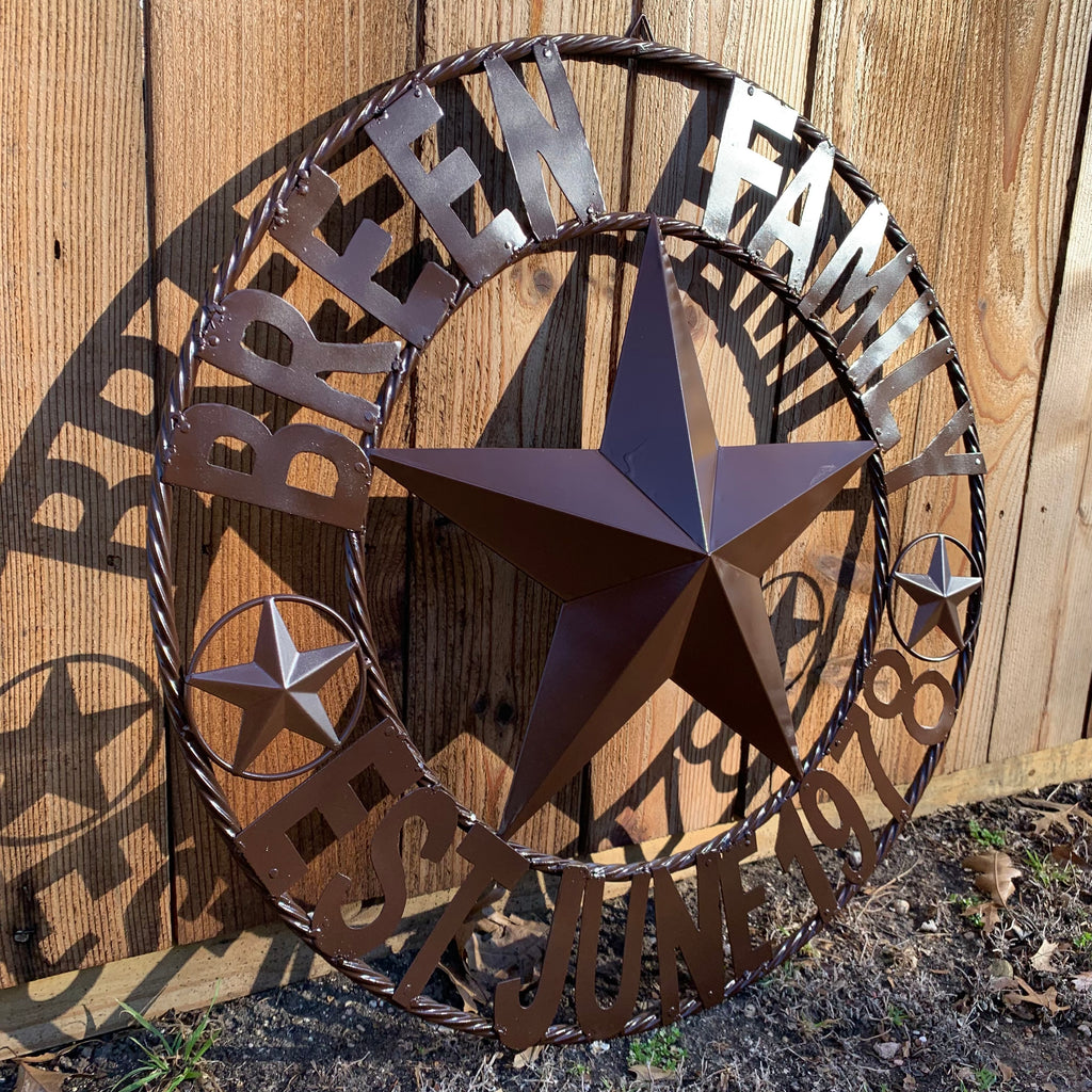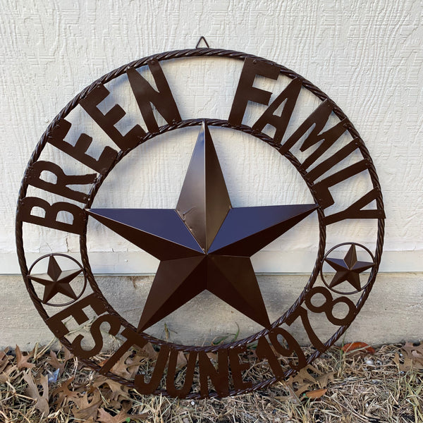 BREEN FAMILY STYLE CUSTOM NAME STAR BARN METAL STAR 3d TWISTED ROPE RING WESTERN HOME DECOR RUSTIC BROWN HANDMADE 24",32",36",50"