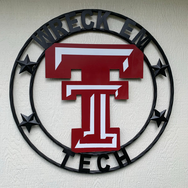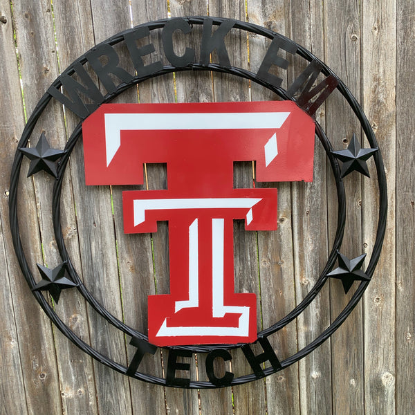 A Beautiful Wreck'em Tech Barn Metal Art Decor to add the perfect touch to your primitive country décor!! This magnificent wall décor is a fun and unique way to declare your love for the house warming, State, School, Western decor, Cowboy, Cowgirl boldly styled and richly detailed shown finish metal craft as shown. The center & outer circle have a rope look. Our Barn Decor are nicely distressed and have a hole at the top for easy display. Many new sizes are available. Great gift for any occasions. Perfect for any size walls. Excellent Condition.