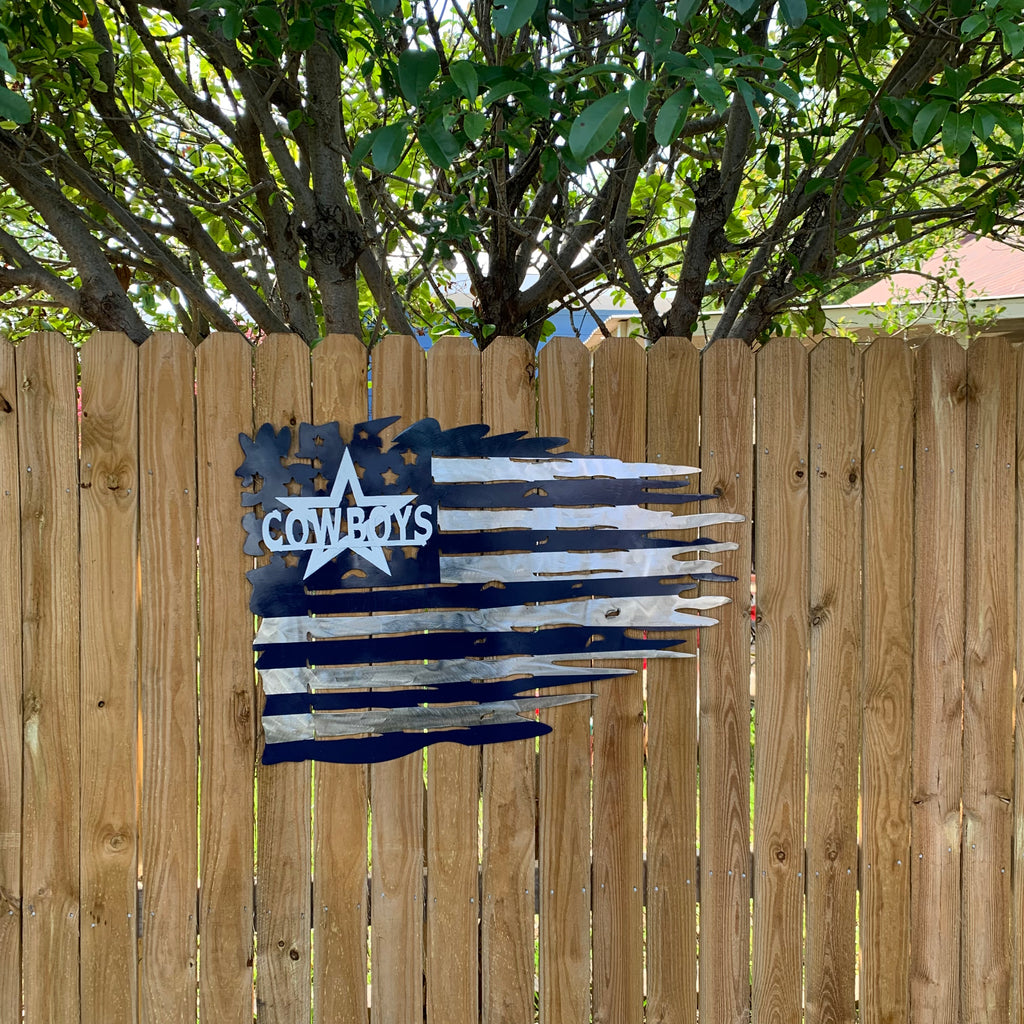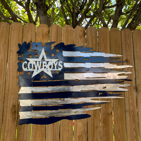 DALLAS COWBOYS TATTERED FLAG NAVY BLUE, WHITE & SILVER METAL BARN WALL DECOR SIGN WESTERN HOME DECOR LASERCUT HANDMADE NEW